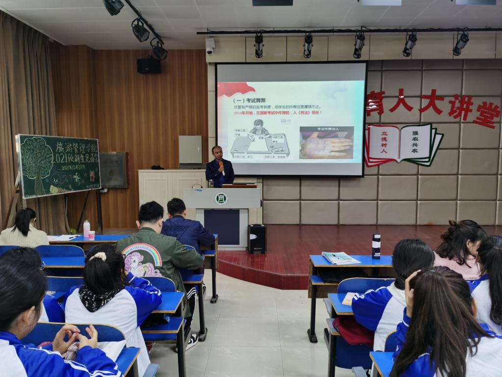 为了引导新生树立廉洁自律观念,自觉践行社会主义核心价值观。10月10日,旅游管理学院在一教E101开展新生入学教育之大学生廉洁教育党课。党总支副书记杜丽、院科级干部和2021级辅导员、全体新生聆听了本次党课。党课由院党总支书记陈建国主讲。