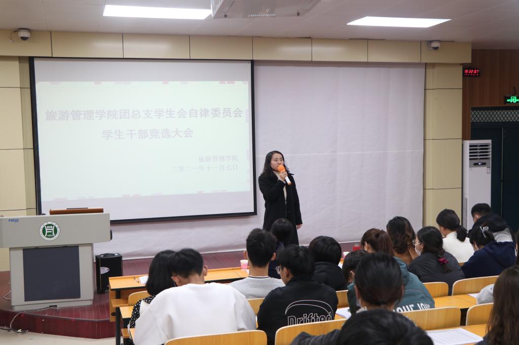 为促进我院学生管理工作的持续稳定发展,给学生管理队伍融入新鲜血液,同时给学生搭建一个展现自我、实践自我的平台,11月7日晚,旅游管理学院团总支学生会自律委员会干部换届竞选大会在二教204拉开帷幕。院党总支副书记杜丽、学工组全体老师、2020届团总支学生会自律委员会主席团成员及各部门学生干部代表以及20级学生代表参加了此次大会。