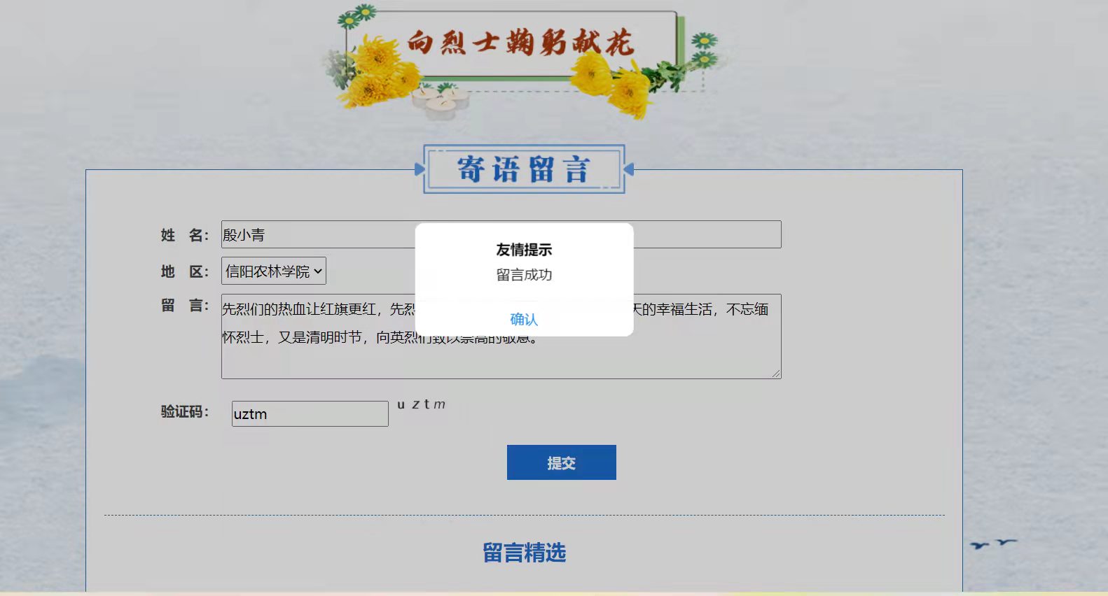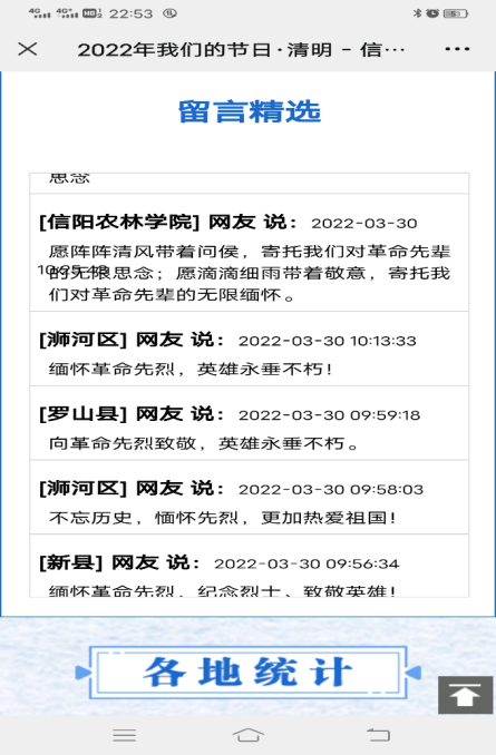 清明节到来之际,为缅怀革命先烈的丰功伟绩,寄托对烈士们的敬仰与哀思,加强革命传统教育和爱国主义教育,旅游管理学院于2022年3月31日-4月1日开展了“我们的节日·清明——网上祭英烈”活动,各班级团支部学生积极参加了此次活动。