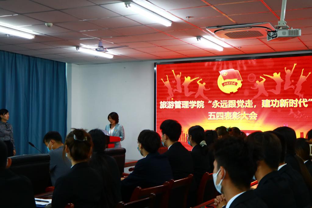 为纪念五四运动103周年,庆祝中国共产主义青年团成立100周年,鼓励广大团员青年以更饱满的精神状态、更务实的工作作风投入到学习生活中,旅游管理学院于2022年5月5日中午在双创楼310会议室召开了“青春心向党,建功新时代”2022年度五四表彰暨学生干部培训大会,院党总支副书记杜丽、副院长陈婷、副院长余兵、全体学工组老师及团员青年代表50余人参加了会议,会议由团总支书记王芳老师主持。