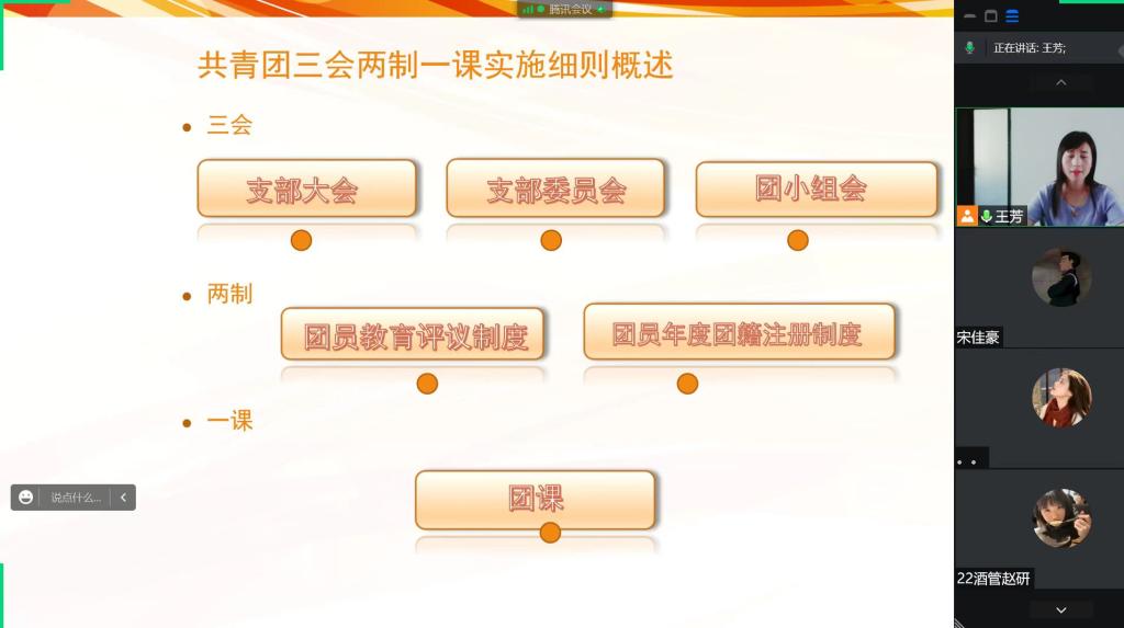 会上,全体师生在王芳的带领下回顾了共青团团史,重温了共青团作为党的助手和后备军在中国共产党的领导下不断发展壮大的艰辛历程。王芳围绕新生团关系的转接、团员发展、班级团支部的建设以及“三会两制一课”实施细则等内容,为大家详细解读。会议最后是交流发言时间,同学们针对各自在团关系转接过程中出现的问题和困惑以及后期发展团员等有关问题进行了提问,王芳分别进行了耐心细致地回答。