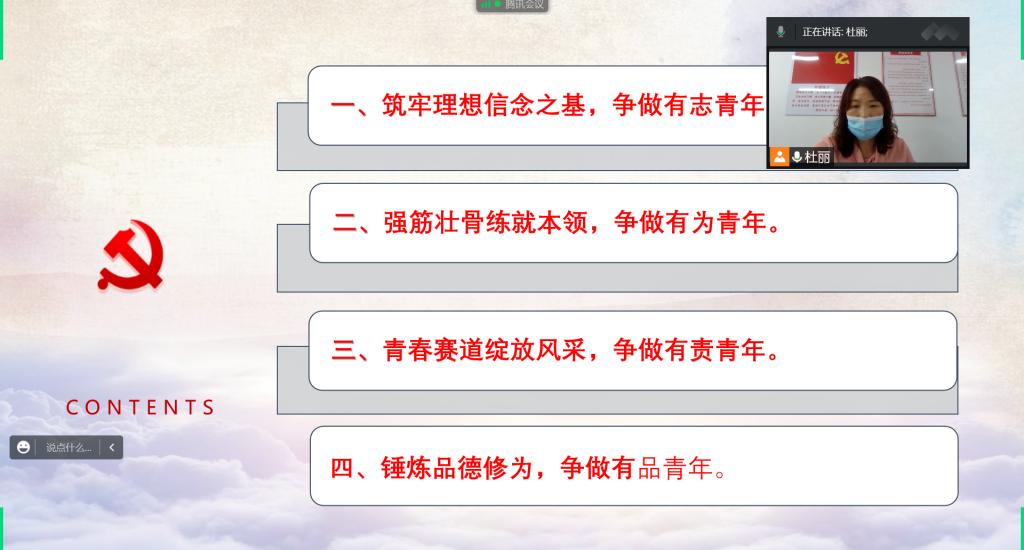 杜丽结合团学工作实际和优秀毕业生典型事迹,分析了大学生活和以往高中生活的不同之处,提醒同学们要尽快完成从高中生到大学生的身份转变,树目标、找方向、多思考、多实践,不断找到真实的自己,并以“喜迎二十大,用奋斗擦亮强国有我青春底色”为主题,希望同学们一要树立远大理想,筑牢信念之基,不忘初心听党话、跟党走,争做强国有我的有志青年;二要培养兴趣,勤奋好学,锤炼身心、勇于奋斗,强筋壮骨、增长才干,努力成为可堪大用的栋梁之才,争做新时代有为青年;三要有家国情怀,珍惜这个时代、担负时代使命,在担当中历练,在尽责中成长,让青春在新的征程上留下无悔的奋斗印记,做一个有责任感的新青年;四是要心怀感恩,勤于修身,注重自律,遵规守纪,时常用真善美来雕琢自己,不断培养高洁的操行和纯朴的情感,争做有志青年。