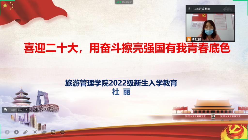 为帮助2022级新生尽快了解大学生活、适应身份转变,引导他们坚定不移听党话、跟党走,争做强国有我新青年,喜迎党的二十大,9月14日上午,旅游管理学院党总支副书记杜丽为全院2022级新生做“思政第一课”报告。