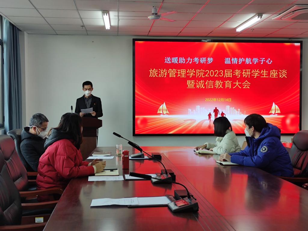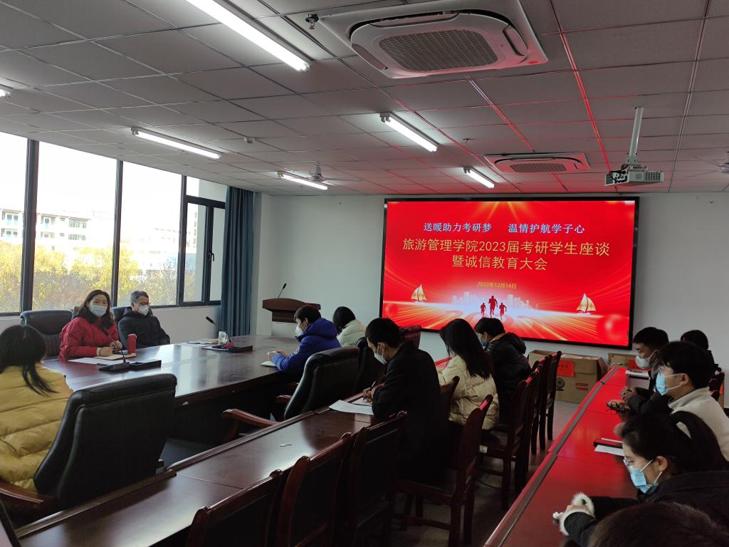为缓解即将考研学子的心理压力,了解考前需求,提供经验和帮助,提升考研信心,12月14日下午,旅游管理学院在双创中心310召开了“送暖助力考研梦 温情护航学子心”2022年研究生考前慰问座谈暨诚信教育大会。院党总支副书记杜丽、副院长余兵、团总支书记王芳、毕业班辅导员及考研学生代表参加了此次会议。会议由杜丽主持。