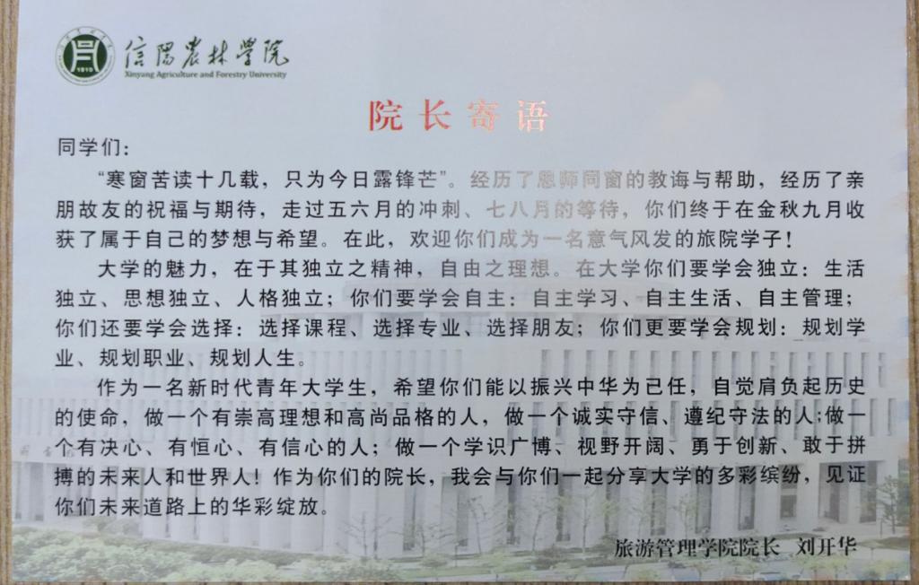为让新生更好地适应大学生活,做好大学规划,树立理想目标,我院为每位新生发放了一张“通往未来”的明信片,明信片正面印有“院长寄语”,背面新生们可以写下自己大学的理想、目标或者规划,完成后交给辅导员保管,待毕业时辅导员再发放给学生,以此回忆自己“最初的梦想”。