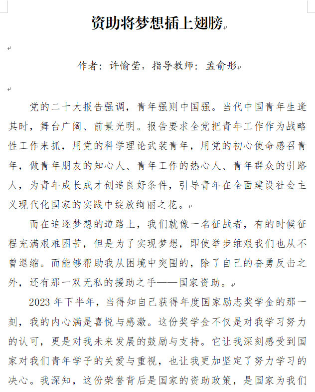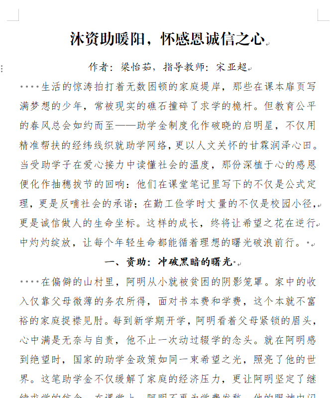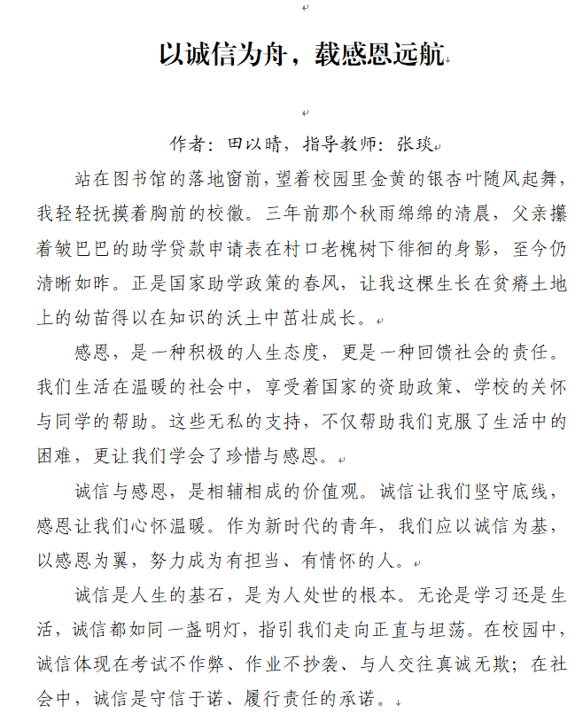 此次大赛以“守诚信之本,怀感恩之心”为主题,活动一经推出,同学们踊跃参与,共征集到40余篇优秀征文。这些征文紧扣主题,内容真实生动,文体丰富多样,同学们结合自身或身边人的受助经历,用文字生动展现了受助后脱困、成长蜕变、诚信感恩的故事,充分体现了党和政府教育资助政策的温暖,也展现出同学们自立自强、成长成才的坚定意志。为确保作品质量,学院对参赛稿件进行了严格评审。评审过程中,评委们从政治方向、主旨立意、素材挖掘、语言表达等多方面严格把关,最终,八篇兼具思想性与感染力的作品脱颖而出,将参与校级决赛评审。