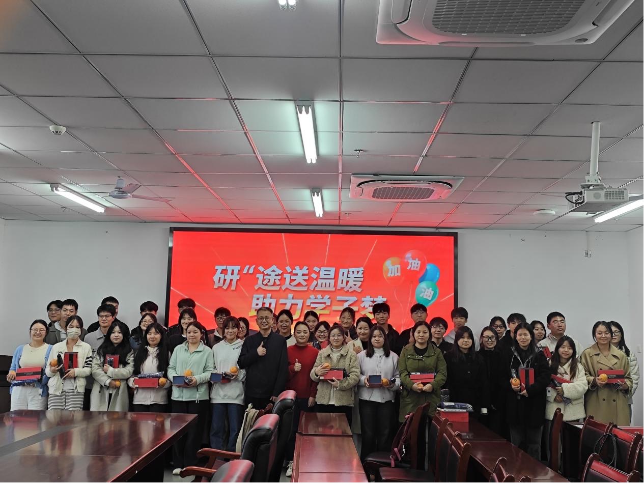 活动当天,学院为同学们精心准备了礼品,这些礼品包含保温杯、棒棒糖、橙子和雨伞。保温杯寓意“温暖相伴”,棒棒糖象征“甜甜蜜蜜”,橙子代表“心想事成”,雨伞则寓意“风雨同舟”。每一样都寄托着学院对考研学子的美好祝愿。