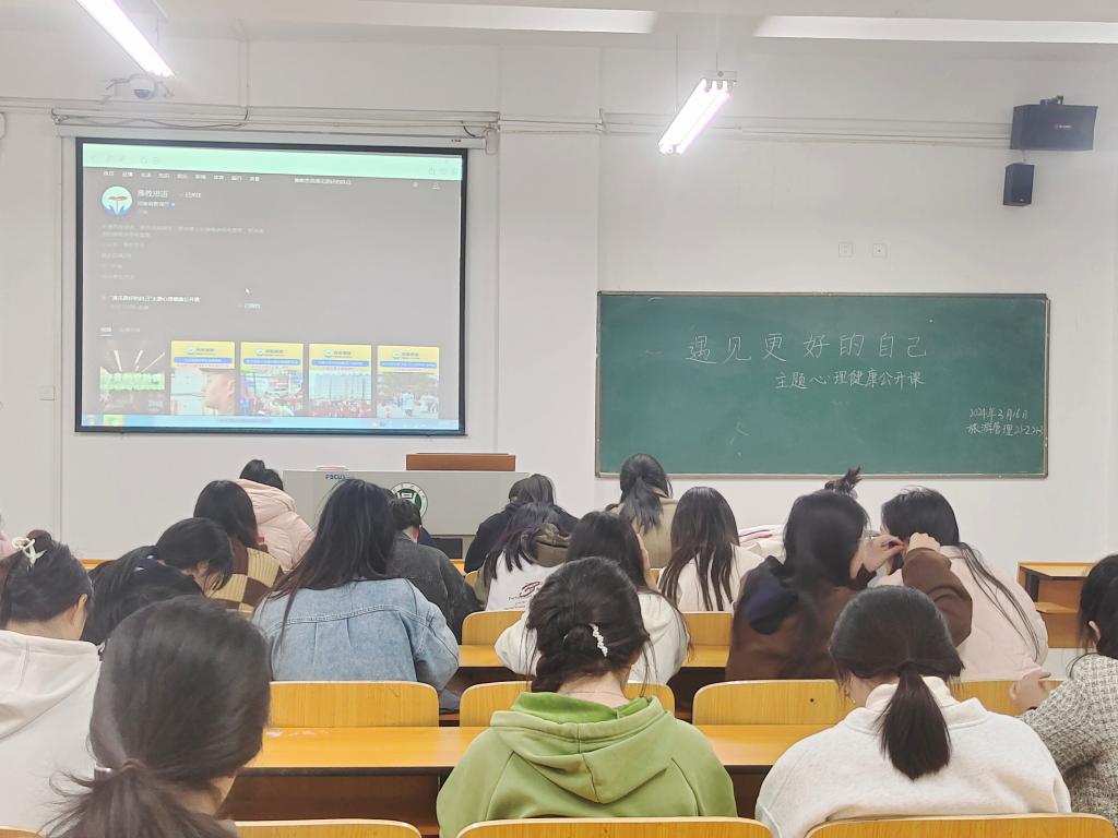 为进一步加强大学生心理健康教育,促进学生身心健康发展,营造积极乐观、健康向上的校园氛,帮助学生更好地认识自己,呵护学生健康成长,旅游学院组织全体学生观看“遇见更好的自己”主题心理健康公开课,各班辅导员组织召开心理健康主题班会。