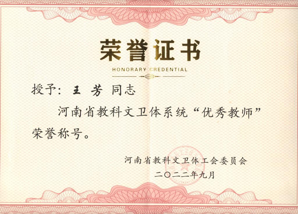旅游管理学院王芳荣获河南省教科文卫体系统“优秀教师”