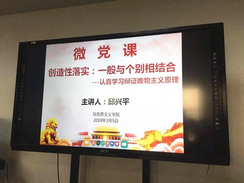 2019年3月5日下午,马克思主义学院在综合办公楼304会议室举行以“创造性落实:一般与个别相结合--认真学习辩证唯物主义原理”为主题的微党课。微党课由原思政部主任邱兴平主讲,马克思主义学院全体教师参加。