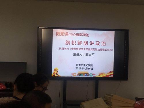 4月16日下午,马克思主义学院举行理论学习中心组学习会,暨主题为“旗帜鲜明讲政治,认真学习《中共中央关于加强党的政治建设的意见》”的微党课。微党课由原思政部主任邱兴平主讲,马克思主义学院全体教师参加。