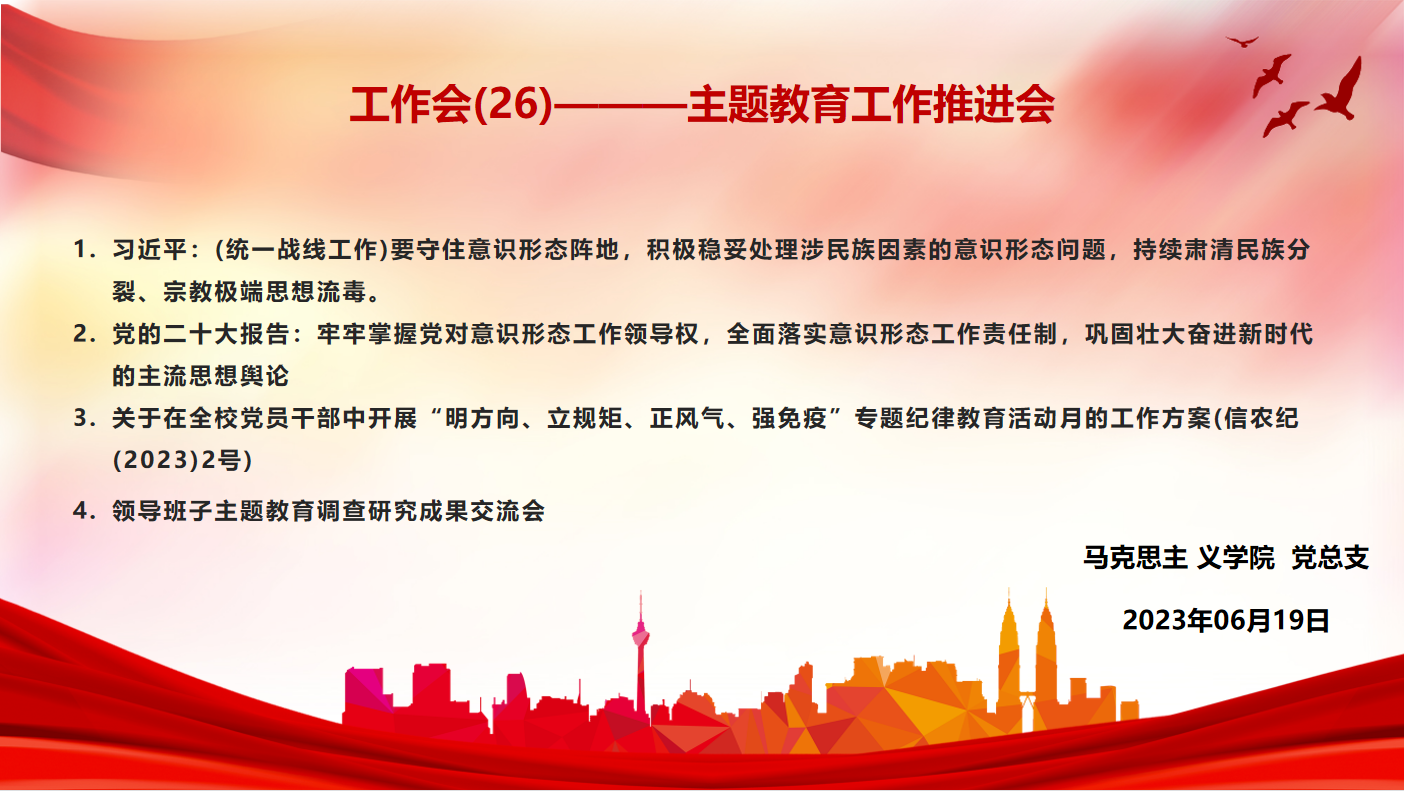 2023年6月19日,马克思主义学院主题教育工作推进会在党员之家召开。马克思主义学院党总支书记、院长邱兴平主持会议,马院党总支副书记、副院长王晓明、马院副院长周俊参加会议。