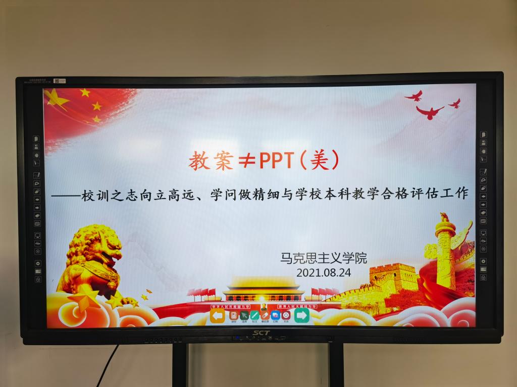 2021年8月24日下午,马克思主义学院在综合办公楼304会议室以“教案≠PPT(美)——校训之志向立高远、学问做精细与学校本科教学合格评估工作”为主题开展“迎评促建”活动。会议由院长邱兴平主持,学院全体教师参加。