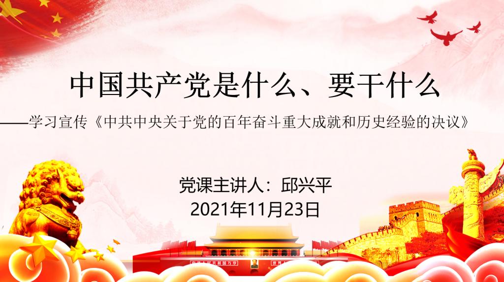 院长邱兴平做了《中国共产党是什么、要干什么》的党课宣讲,主要内容是学习宣传《中共中央关于党的百年奋斗重大成就和历史经验的决议》,他从为什么要起草《决议》、学习《决议》要把握三个要点、《决议》稿起草过程以及《决议》主要内容四个方面向全院教师进行了详细解读。