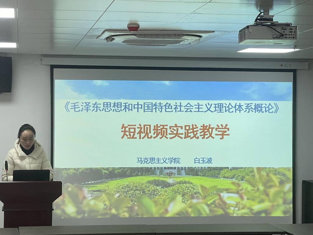 白玉波老师分享了思政课短视频实践教学改革的经验。她讲到一堂思政课上得好不好,从同学们的抬头率就可以清晰得感受到,如果一味的理论灌输,收效甚微,指导学生拍摄短视频是进行思政课教学改革的一种方式,这种教学方式能够有效激发学生的学习热情和兴趣。并指出,下一步将指导学生参加全国思政课微电影大赛,以赛促教,让学生在理论与实践地互动中不断汲取养分,丰富思想,推动习近平新时代中国特色社会主义思想入脑入心。