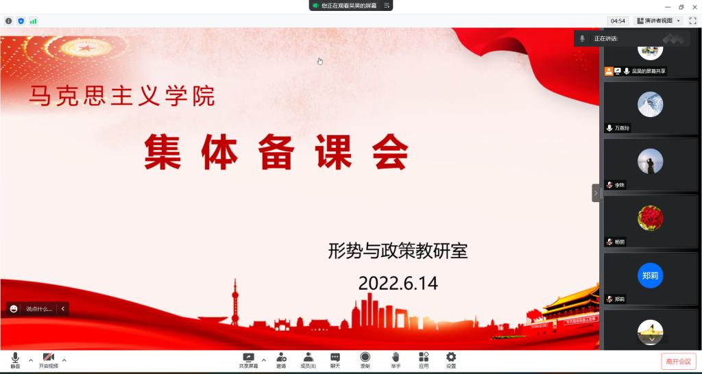 为贯彻落实学校“教学质量年”活动的安排部署,深入开展应用型本科教育教学思想“大学习大讨论大提升”活动,引导教师更新课堂教学观念,提高教育教学能力。6月14日下午,形势与政策教研室通过腾讯会议召开2022春夏学期第九次集体备课会。会议由教研室主任吴昊主持,全体专兼职教师参加。