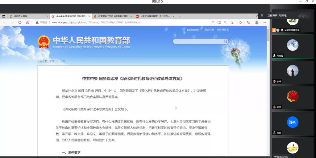 会上,形势与政策教研室全体教师集中学习了《新文科建设宣言》、《教育部关于高等学校课程思政建设指导纲要》和中共中央国务院印发《深化新时代教育评价改革总体方案》等材料,参会教师结合自身教学工作,进行了积极思考和讨论。