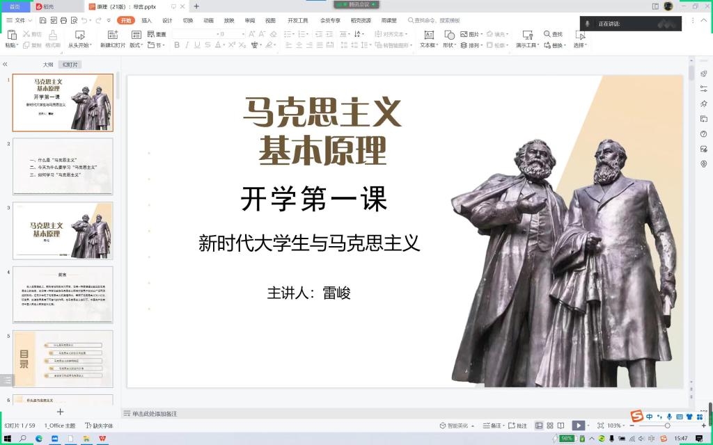 8月29日,beat365在线平台官网2022年秋季开学第一天,马克思主义学院高度重视,提前安排部署,以教研室为单位组织集体备课,研究教学大纲、教材、教学重难点、教学方法、课件等主要内容,交流意见建议,统一思想认识。马克思主义基本原理教研室雷峻老师通过腾讯会议以《新时代大学生与马克思主义》为主题,为园艺21-3-5班上了一堂精彩的思政课,课后同学们纷纷说,作为新时代的青年大学生,当立鸿鹄志、树兴国梦、成栋梁材的铮铮誓言。