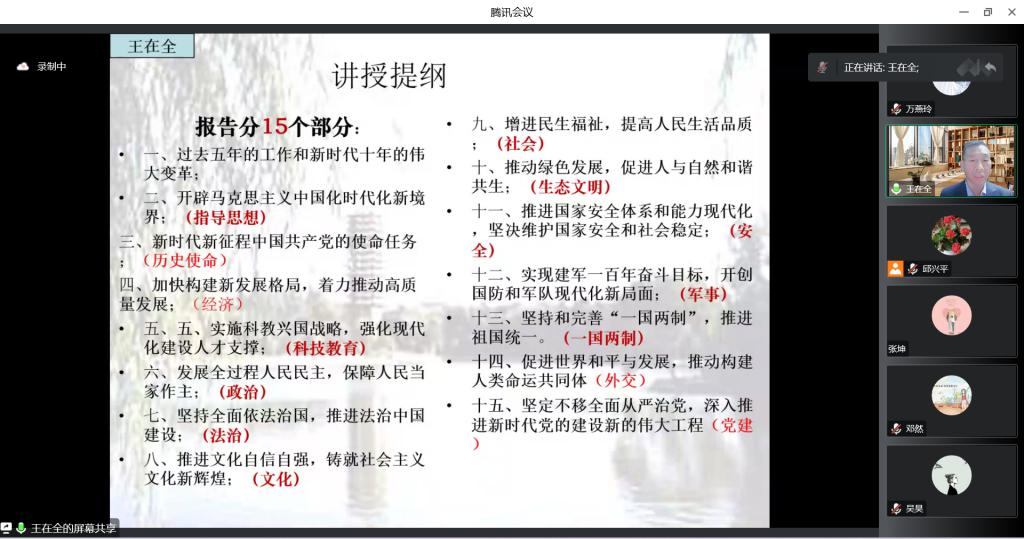 王在全教授从序言、总论、分论等15个部分对党的二十大精神进行全方位解读,系统地阐述了党的二十大提出的重大思想观点、重要论断、重大举措。讲座通过大量历史事实和丰富案例,对党的二十大精神进行了系统阐述和深入解读,具有很强的理论性、启发性和指导性。