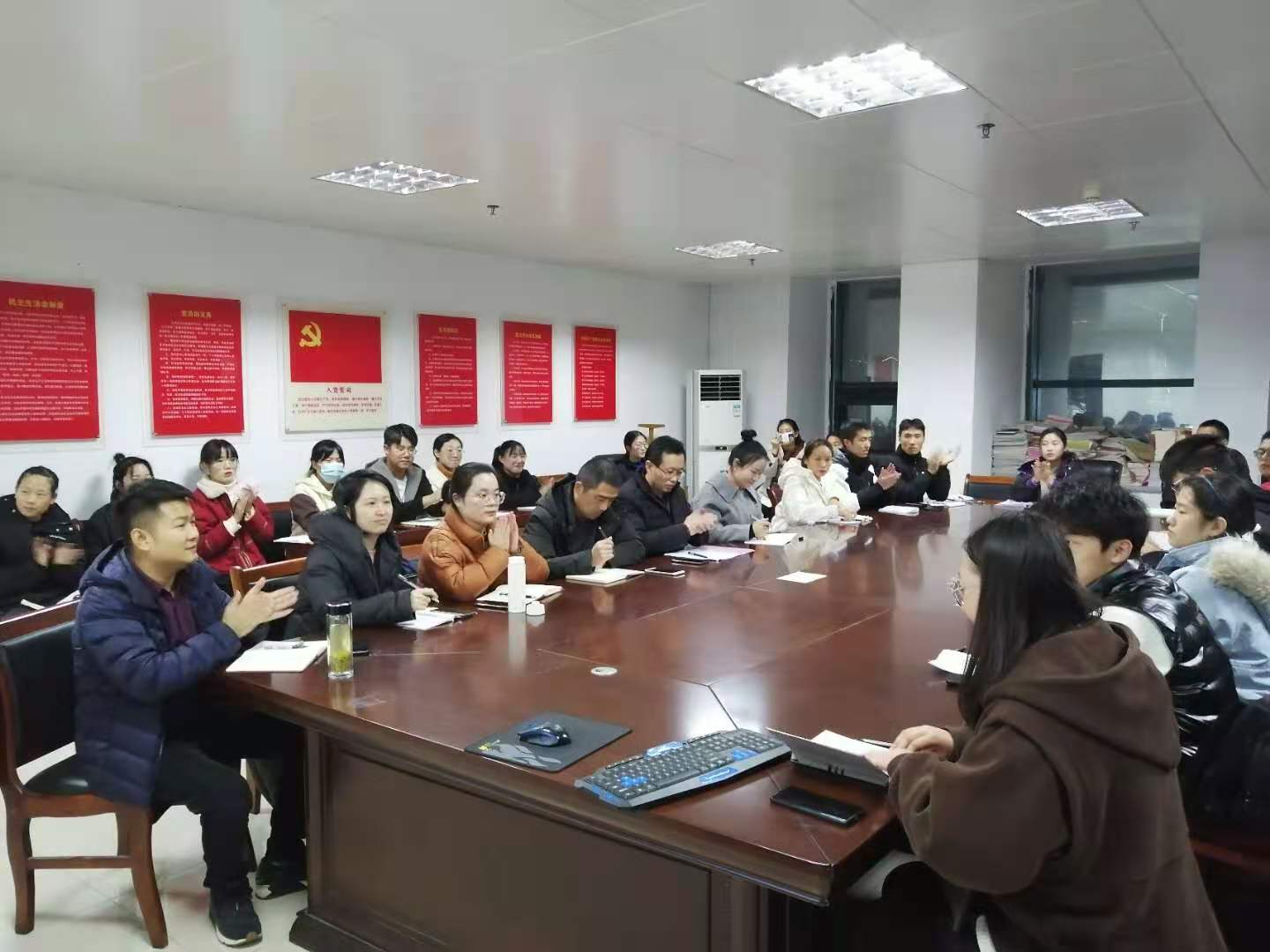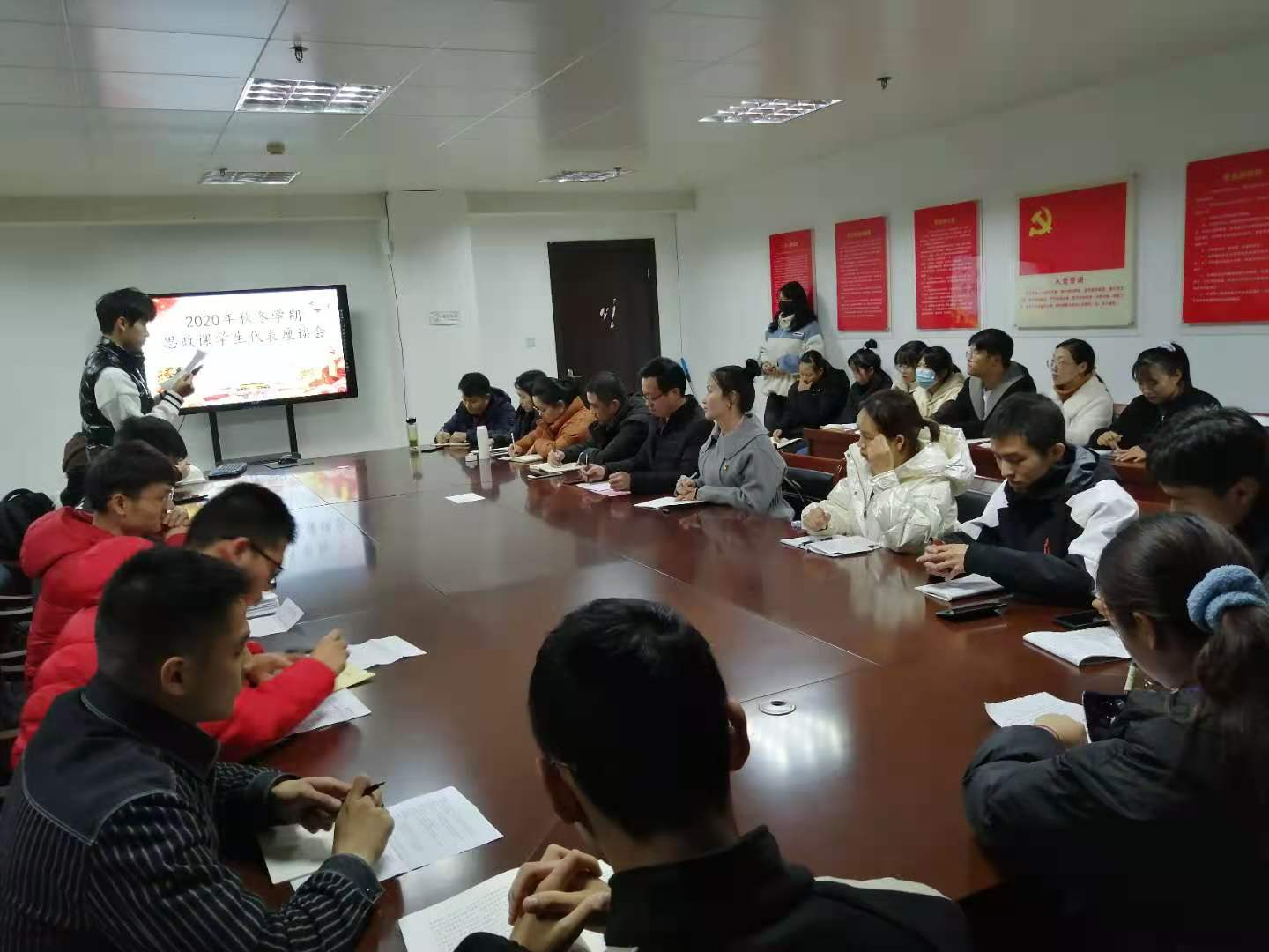 为及时了解和把握思政课教育教学情况,进一步加强教学管理,不断提高教学针对性和实效性。马克思主义学院思想道德修养与法律基础教研室于2020年11月22日晚在行政楼304会议室举行了2020年秋冬学期思政课学生代表座谈会。马克思主义学院副院长周俊、思修课教师及27名学生代表参加座谈会,教研室主任姚鑫宇主持座谈会。