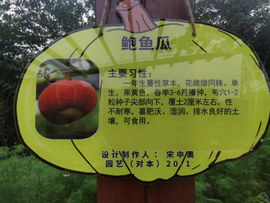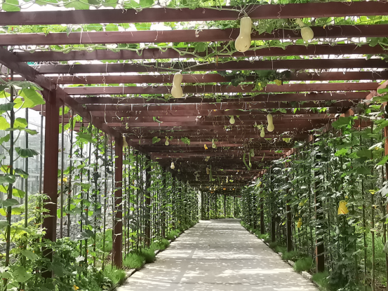 在建筑学上廊作为室内外的过渡空间,是构成建筑物造型上虚实变化和韵律感的重要手段,对空间的格局、体量的美化起重要作用,并能造成庄重、活泼、开敞、深沉、闭塞、连通等不同效果。园林中的游廊则主要起着划分景区、造成多种多样的空间变化、增加景深、引导最佳观赏路线等作用。近年来随着一二三产业融合发展,休闲观光农业和创意农业等新兴业态兴旺,花果长廊遍地开花结果,为不仅为人们提供采摘,农事体验、休闲观光和科普教育,也大大提高了农业多功能性,成为农民增收致富梯。园艺学院校内实习基地南瓜长廊全长130米,宽3.5米,高3米,共有观赏南瓜丝瓜黄瓜近20个品种。每个品种科普标识牌由园艺学院学生设计制作。