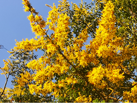 “金雨树”和“黄金树”:栾树在夏初开小黄色花,满树金黄,花谢时落花如雨,地面就会铺满一层细碎的金黄色小花,英语称它为“金雨树”,黄金树。