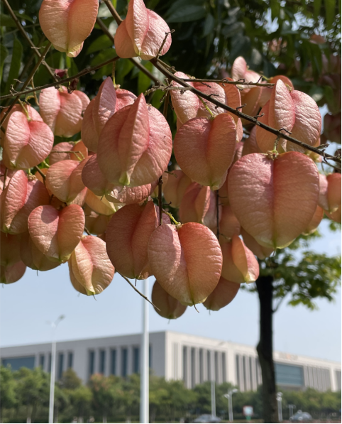 “摇钱树”和“灯笼树”:花落后结出一串串皮质蒴果,内包有黑色小球形种子,蒴果如同中国灯笼,因此也被称为“灯笼树”。蒴果刚开始是绿色,后来慢慢由黄转为粉红色,嫰青、鹅黄与粉红色会同时渲染在高高的枝稍,非常美丽。静静地站在树下,微风拂过,果实摇曳,能听到有节奏的“哗哗”响,像一串串元宝摇摇欲堕有趣儿、吉祥,因此它的别名叫“摇钱树”。