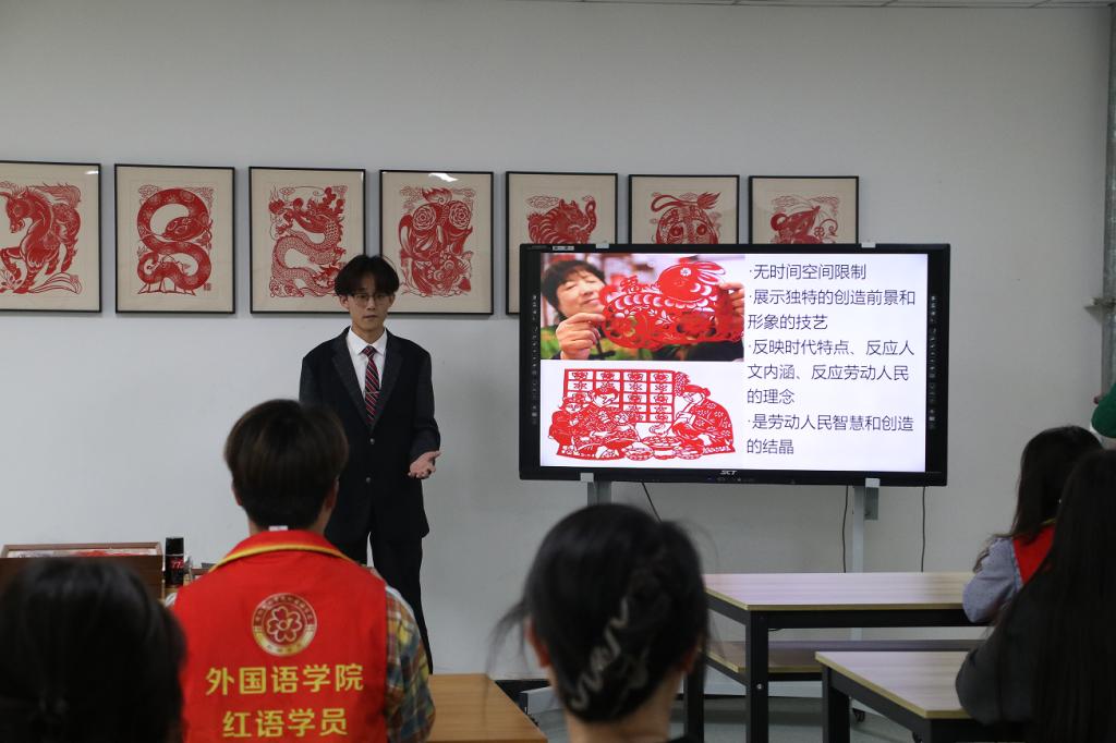 活动伊始,应用英语24-1班的王景博同学以一场精彩的英文演讲,介绍了中国非遗剪纸文化的深厚底蕴。他以流利地道的英语,生动讲述了剪纸艺术的历史渊源与文化价值,激发了在场师生对中华优秀传统文化的自豪感与认同感。