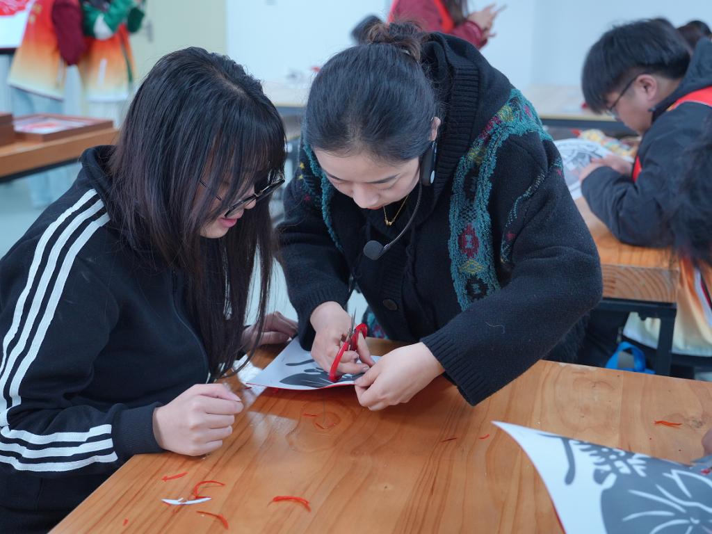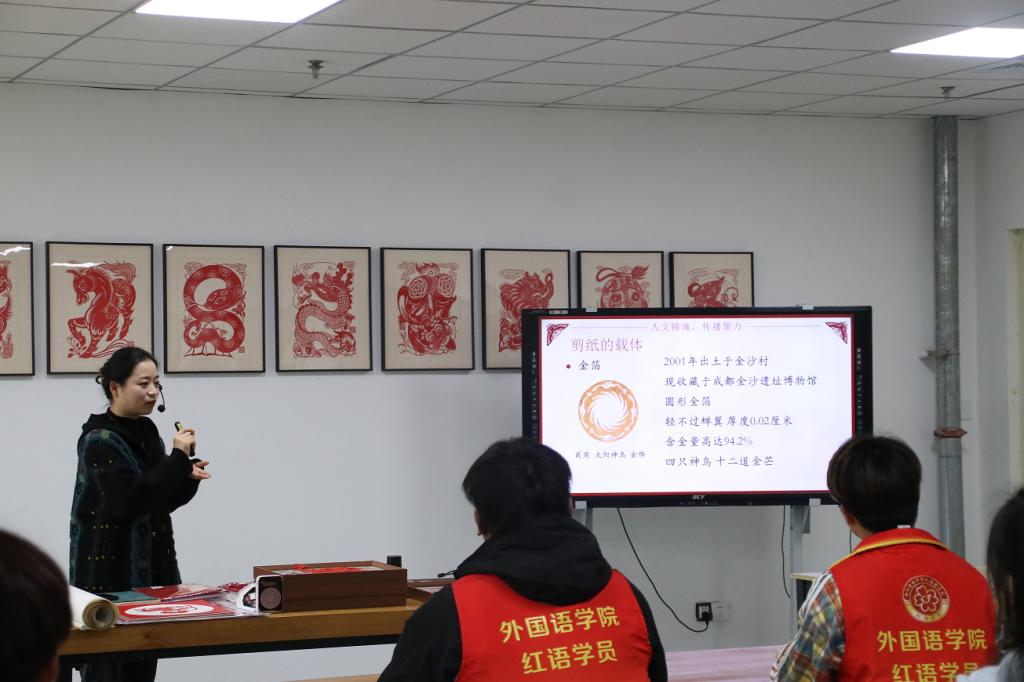 随后,赵展老师从文化背景、民俗功能、代表题材、剪纸技艺、信阳地区的代表性艺术家及其作品鉴赏等多个维度,深入浅出地讲解了信阳剪纸的地域特色与艺术魅力。她以丰富的知识储备和生动的语言,带领大家领略了信阳剪纸南北交融的独特风格,现场师生沉浸其中,反响热烈。