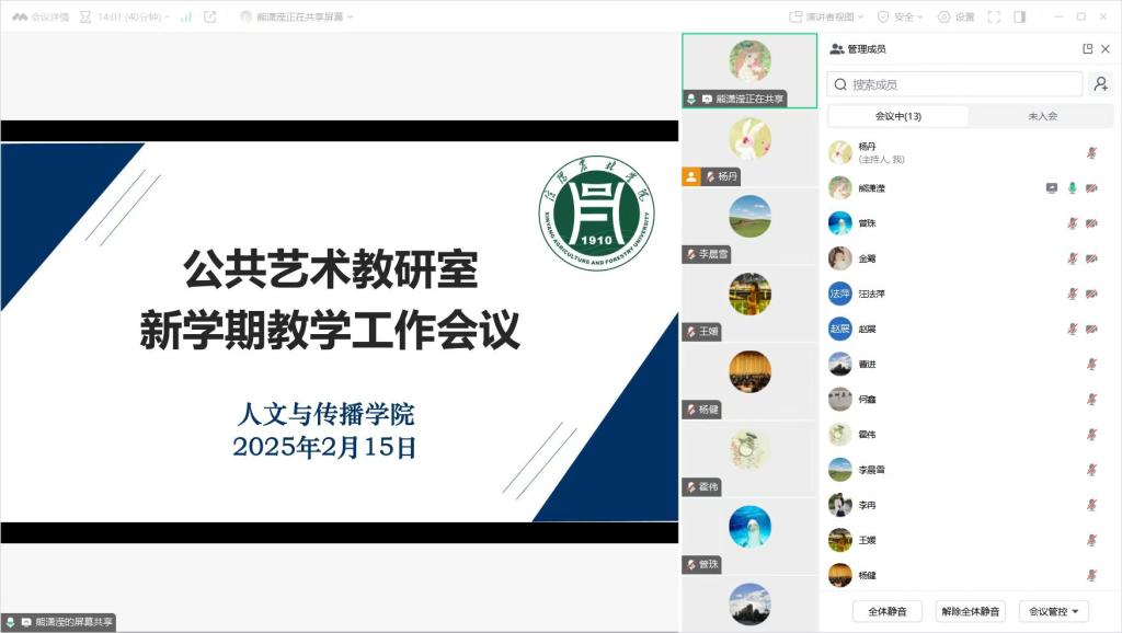 为确保新学期教学工作平稳有序开展,进一步提升公共艺术课程教学质量,2月15日下午,公共艺术教研室在腾讯会议开展了新学期教研工作会议。公共艺术教研室全体教师参加了会议,会议由教研室副主任熊潇滢主持。