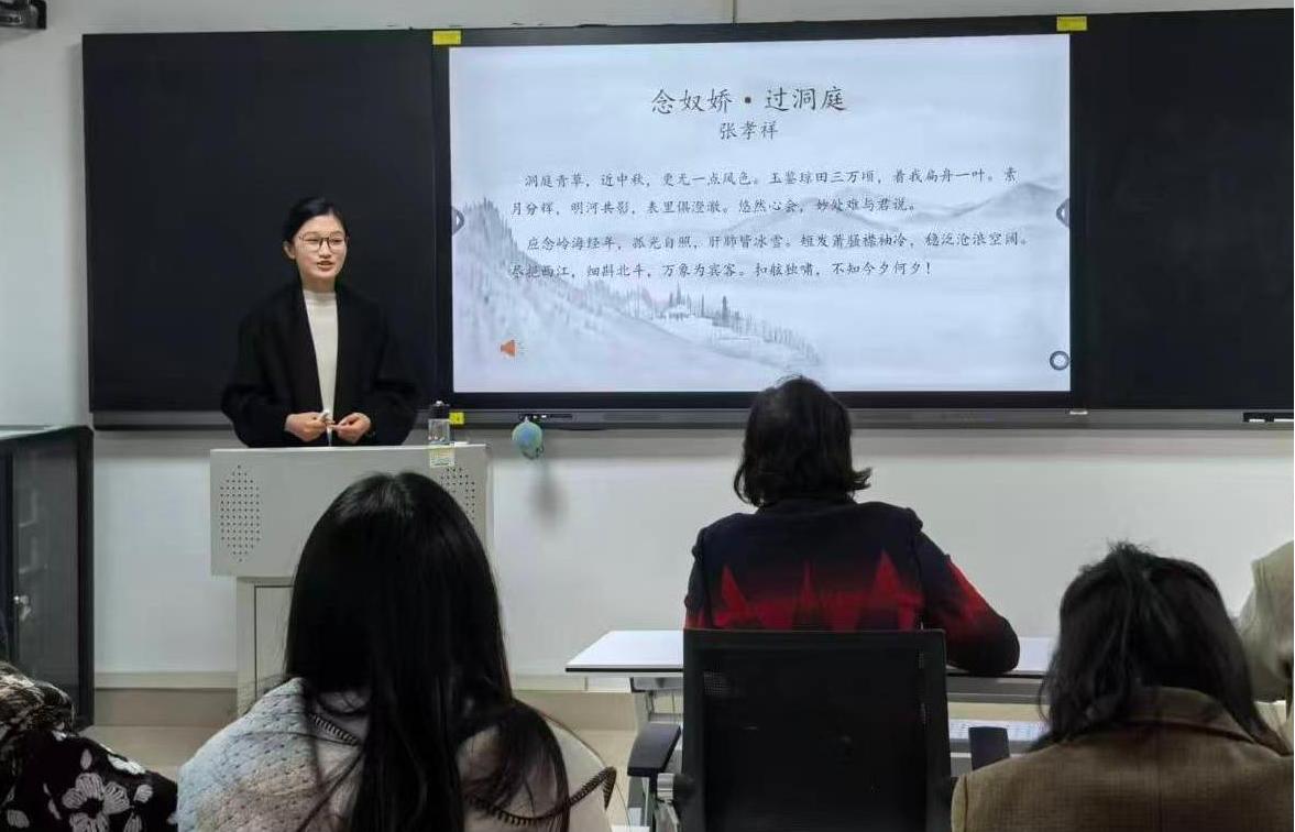 试讲环节中,刘园老师讲授的是中国古代文学的名篇《念奴娇·过洞庭》,通过诗词意象的详细解析,引导学生感受传统文化魅力;李可心老师聚焦法国电影鉴赏,教学环节完整,课件制作精美,展现出清晰的教学逻辑。教研室老师对两位新教师的教态及语言表达给予一致肯定,同时针对教学细节提出优化建议,试讲教师认真记录评议意见,表示将结合指导意见打磨教学设计,提升教学实效。