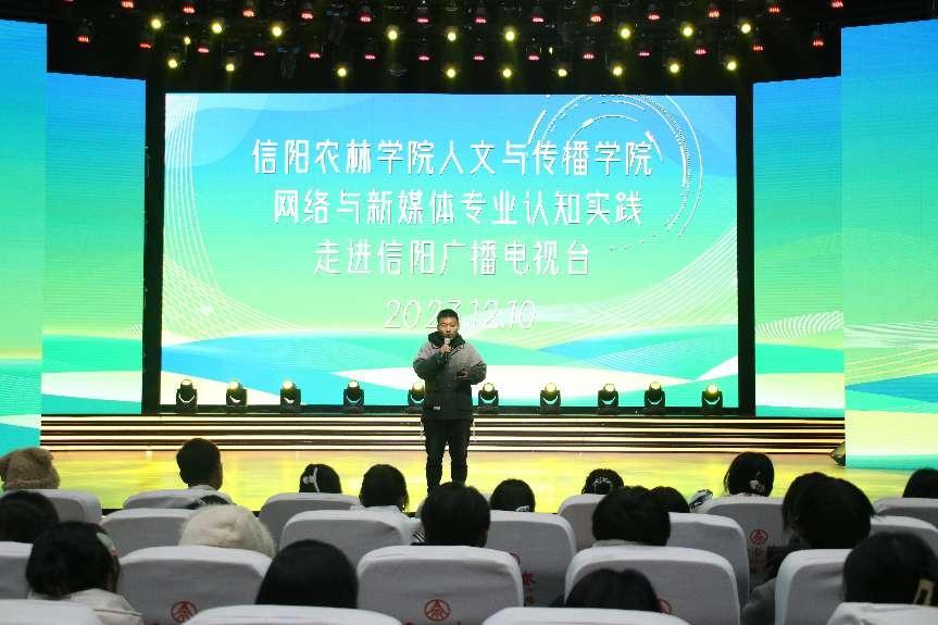 12月10日,师生们一行来到信阳广播电视台演播中心,通过现场观看融媒体作品《这里是信阳》,充分感受融媒技术赋能,给传统媒体创新发展带来的机遇和挑战。王淑君老师详细介绍了演播中心的主要功能和发展历程,分享了自己从事新闻工作20多年来的难忘瞬间和感人故事。她勉励同学们要树立正确的新闻观,培养良好的职业素养,在学好专业知识的同时,加强团队协作能力、新闻实践能力,努力成为党的新闻事业需要的优秀人才。2022级网络与新媒体的学生田原也给大家带来了特别的“学长分享”,给同学们讲述了从入学到大二的心路历程。随后,师生有序参观了演播中心融媒体编辑机房、调度指挥中心、播控中心,对广播电视大型活动和专业节目的创作流程、制作环境等有了初步了解。