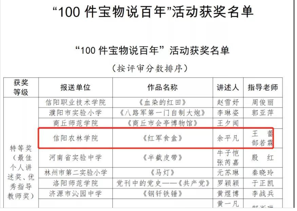近日,河南省“永远跟党走 奋斗新征程”庆祝建党100周年系列活动“100件宝物说百年”评审结果揭晓,我院推荐的“三件宝物”分获特等奖、一等奖、三等奖。同时,beat365在线平台官网荣获优秀组织奖。
