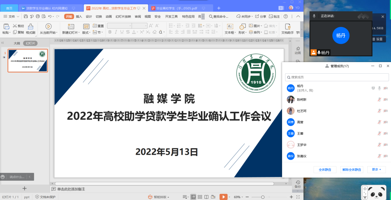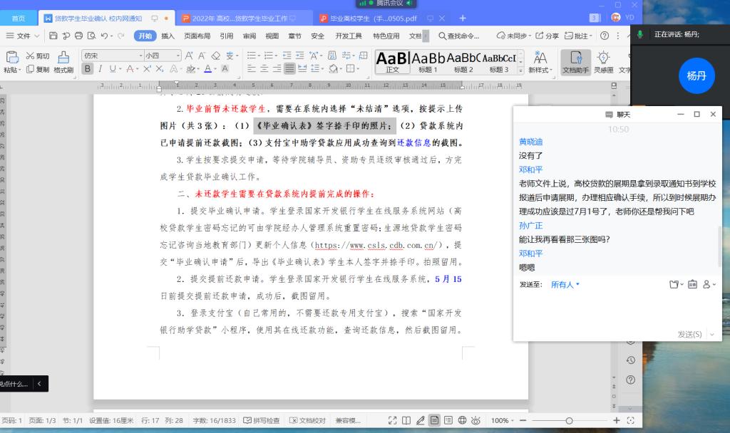 为做好2022年毕业生高校助学贷款、生源地助学贷款服务工作,提高毕业生的还款意识,增强大学生的诚信意识,促进贷款工作健康有序开展,根据校资助中心“诚信教育活动月”工作计划安排,5月13日上午,我院通过腾讯会议召开了2022年毕业生助学贷款毕业确认工作会议。此次会议由资助专员杨丹主持,院团总支书记王蕾与2022届全体贷款毕业生参加。