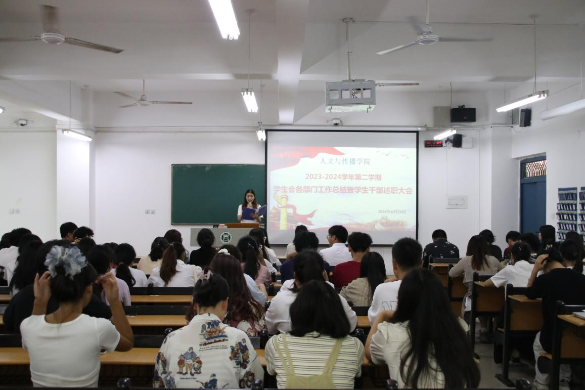 为推动我院学生工作更好的发展,人文与传播学院于6月24日在教二楼101举行了学生会、团总支、自律委各部门本学期工作总结述职大会。总结大会由学生会主席兰雨童主持,学院党总支副书记时华玉、团总支书记王蕾,辅导员余功一以及学生会、团总支、自律委全体成员参加。
