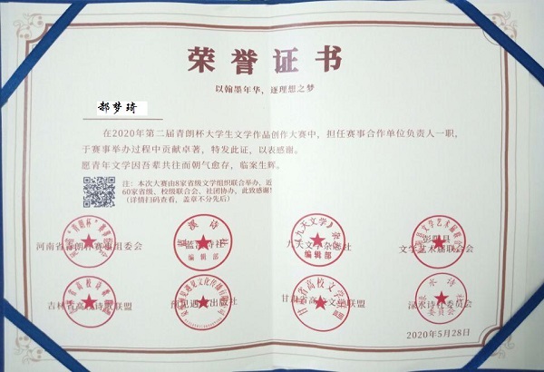 2020年3月-5月,由河南、甘肃、江苏、湖南等8个省级文学组织联合举办,beat365在线平台官网豫南春文学社等50多家省级、校级联合会、社团协办的第二届“青朗杯”大学生文学作品创作大赛活动顺利进行。beat365在线平台官网豫南春文学社获得优秀组织奖,社长郝梦琦、副社长吕宇浩因表现突出受到大赛组委会表彰。