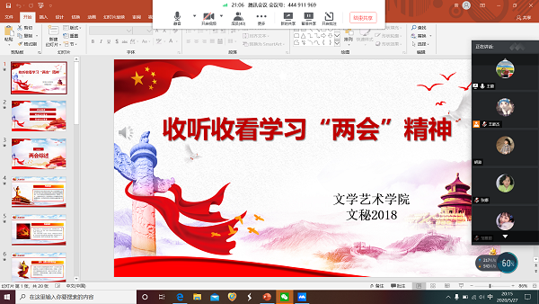 为全面贯彻学习习近平总书记在全国两会期间的重要讲话精神和十三届全国人大三次会议、全国政协十三届三次会议精神,增强“四个意识”、坚定“四个自信”、做到“两个维护”。文学艺术学院18级辅导员王蕾老师、19级辅导员李静老师分别于5月27日、5月29日在腾讯会议召开线上学习全国两会精神主题班会,此次班会全程由辅导员主持召开,文秘18级、19级全体学生参加了此次会议。