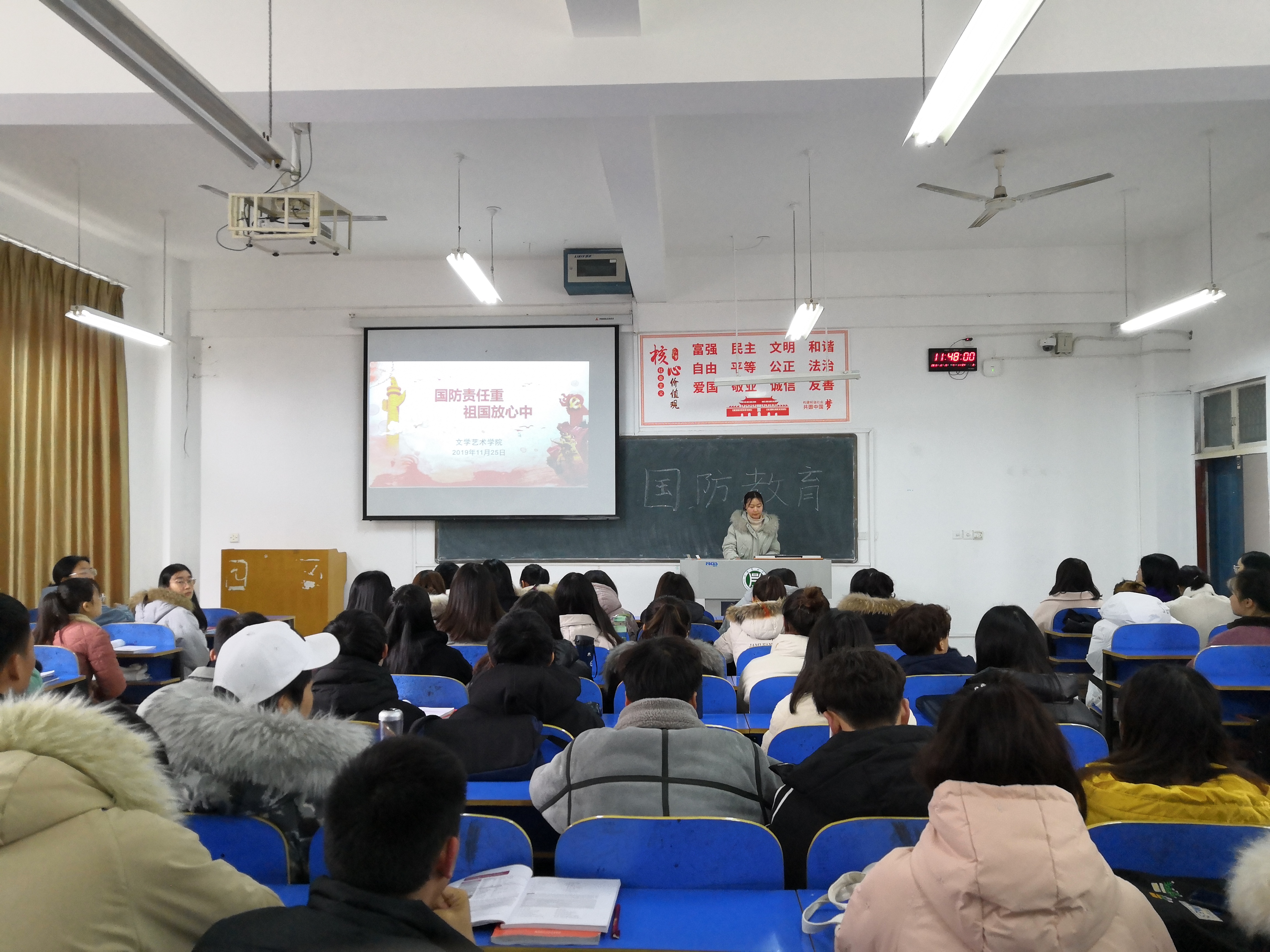 为了增强大学生的国防意识,培养学生的爱国主义情怀,11月25日中午,文学艺术学院在C102开展了国防教育讲座,本次报告由武装专员王蕾老师主讲,文秘专业2018级、2019级学生参加。