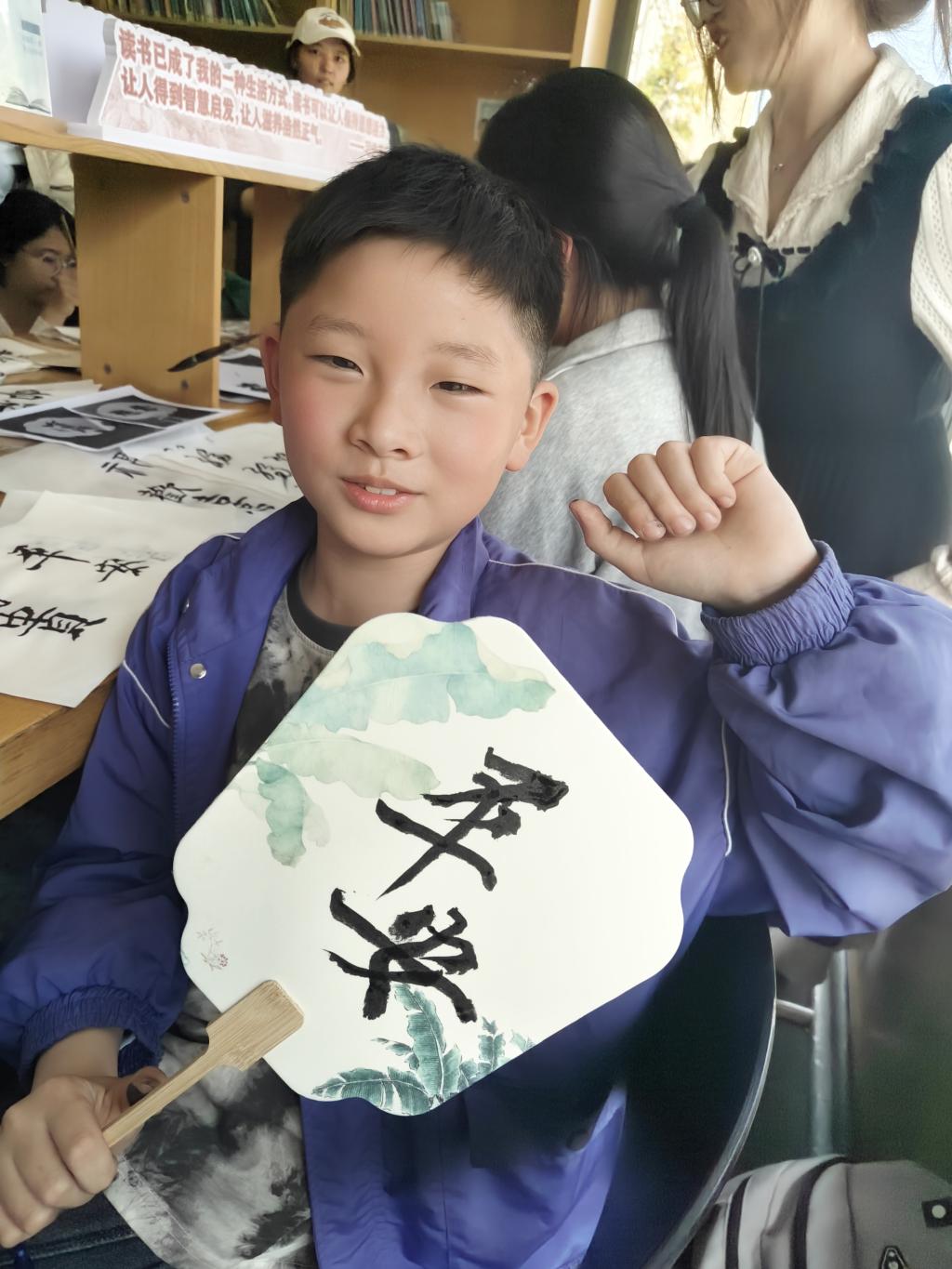 本次活动特别选用素面团扇作为创作载体,在老师和学生志愿者指导下,中小学生将练习成果书写至团扇上。10岁的詹竞迪小朋友举着写有“福来”和“喜乐”二字的团扇兴奋地说:“我要把扇子送给我的爸爸妈妈,这是我一笔一画写的,比买的更有意义!”最终完成的20余把团扇作品在书屋和广场前集中展示。