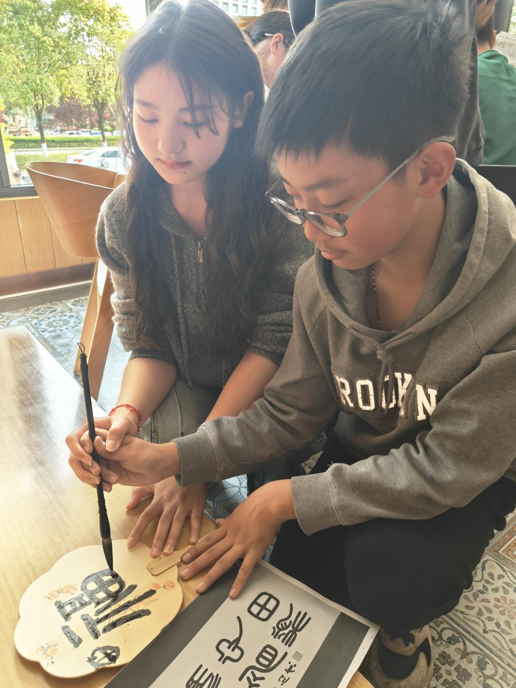 活动伊始,李冉老师为同学们介绍了我国五体篆书法隶楷行草的艺术特征,并生动形象的地展示了五体书法的用笔用墨技巧与方法。大学生志愿者一对一指导参与活动的中小学生,从握笔姿势、基础笔画到章法布局进行手把手教学。我院网络与新媒体23-4班学生赵璇表示:“他们对毛笔充满好奇,我们不仅要教技法,更要激发他们的兴趣。”活动现场,中小学生认真临摹“平安”、“吉祥”、“喜乐”“和”“福”等汉字,志愿者们用生动的比喻讲解运笔技巧——“横如扁担要平稳,竖似悬针需挺拔”,书屋中洋溢着欢声笑语。‌