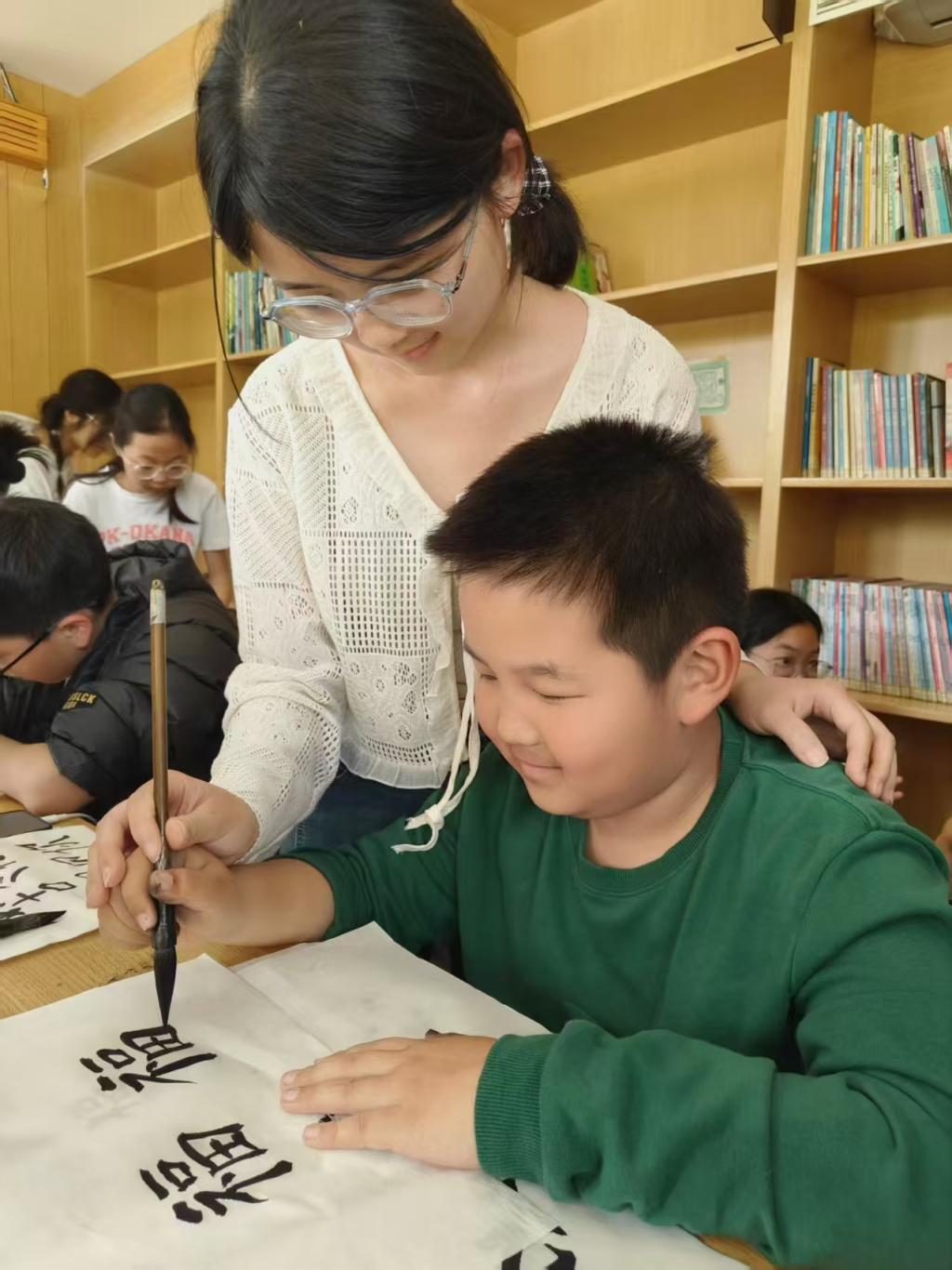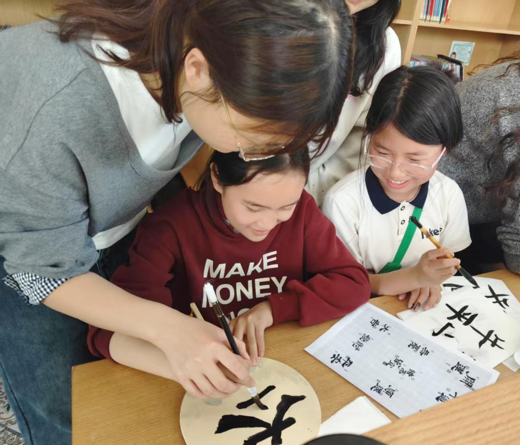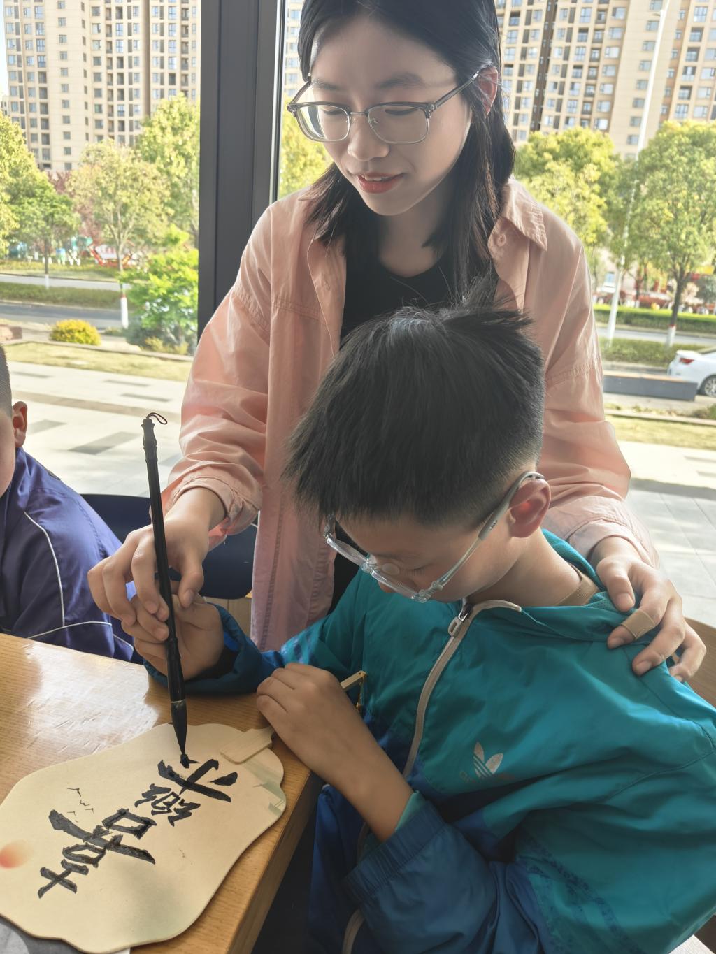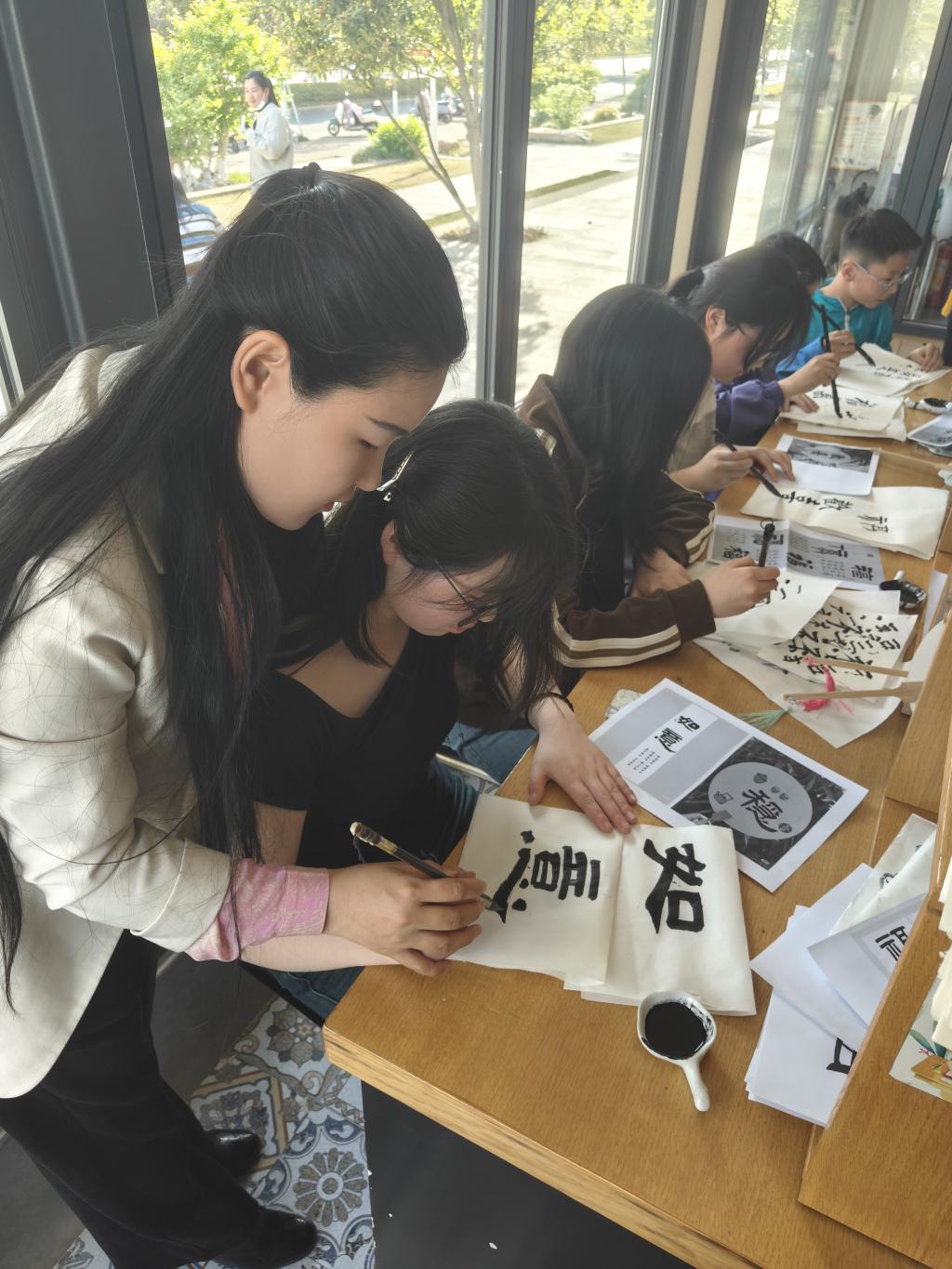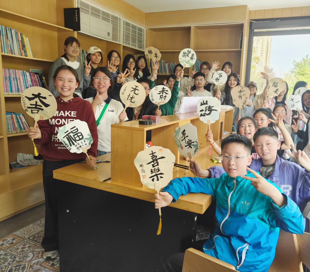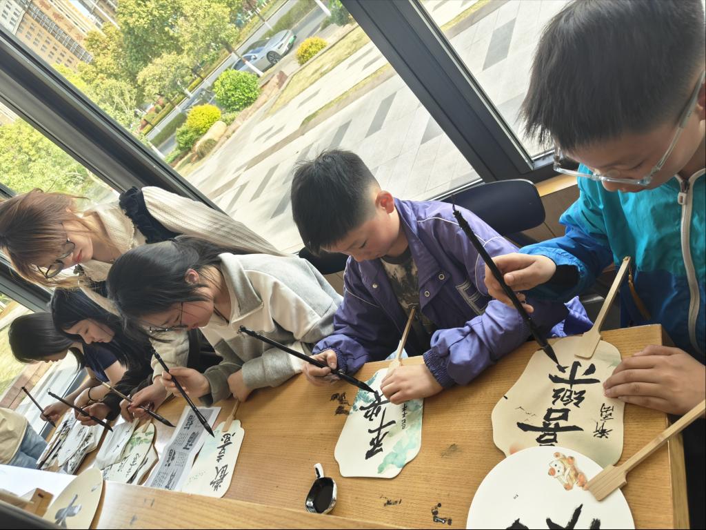 为弘扬中华优秀传统文化,丰富中小学生课余文化生活,使法艺术更加贴近学生的日常,4月5日,人文与传播学院公共艺术教研室专任教师李冉带领15名大学生志愿者共同走进羊山新区“两个更好”城市书屋,开展主题为“翰墨金石 登高致远”书法志愿服务活动。活动通过“大手牵小手”的形式,指导中小学生创作书法团扇作品,让传统文化在趣味实践中焕发新活力。‌