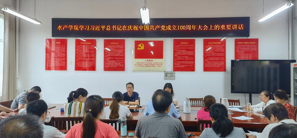 水产学院党总支书记、院长郭旭升同志要求全院上下把学习贯彻讲话精神作为当前首要政治任务,迅速掀起学习宣传贯彻的热潮,切实用习近平总书记“七一”重要讲话精神武装头脑、指导实践、推动工作。院领导班子和各支部书记要带头示范学,带动广泛学,迅速掀起学习热潮,切实增强“四个意识”、坚定“四个自信”、做到“两个维护”。要以习近平总书记重要讲话精神为根本遵循,要深刻领会伟大建党精神,继续弘扬光荣传统、赓续红色血脉、锤炼政治品格,更好担负起时代重任;要深刻领会以史为鉴、开创未来的“九个必须”的重大要求,把已经取得的成绩看作事业新的起跑线,走好新的赶考之路;要深刻领会习近平总书记向全党发出的号召,团结带领全院广大党员干部坚定理想信念,践行党的宗旨,沿着习近平总书记指引的方向坚定前行;要扎实做好党史学习教育,团结带领全院师生以更加昂扬的精神砥砺奋进,以更加严实的作风干事创业,凝心聚力做好迎评促建,坚决打赢这场攻坚战,为学校本科合格评估和建设特色鲜明应用型大学做出应有贡献,奋力书写好水产学院建设发展的现代化新篇章!
