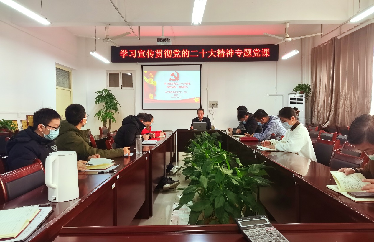郭旭升同志从“充分认识学习宣传贯彻党的二十大精神的重要意义”、“党的二十大报告需要把握的十个方面”、“学习贯彻党的二十大精神要做到学懂弄通做实”等三个方面向大家宣讲了党的二十大精神。他指出,学习宣传贯彻党的二十大精神是当前和今后一个时期首要政治任务,各个支部要持续深入学习领会党的二十大精神,切实用党的二十大精神统一思想、统一意志、统一行动。最后,郭旭升同志强调,学院全体师生一要在学深悟透上下功夫,党的二十大精神内涵丰富,博大精深,要坚持原原本本学,联系实际学,确保学深学透、入脑入心。二要在全面把握上下功夫,全面把握习近平新时代中国特色社会主义思想的世界观、方法论和贯穿其中的立场观点方法,深刻领会“两个结合”、“六个坚持”,正确认识把握习近平新时代中国特色社会主义思想的精神实质,增强贯彻落实的自觉性和坚定性。三要在全面落实上下功夫,空谈误国,实干兴邦,坚定不移把党的二十大提出的目标任务落到实处,要坚决把党的二十大决策部署变为生动实践,努力将学习成果转化为做好学院各项工作的实际举措。学院要围绕打造一流平台,建设一流团队,着力深化科研创新和人才培养方面的改革,不断强化内涵建设,进一步凝练专业特色,形成学科优势,把特色学院打造成特色加优势学院。培养更多高素质的知农爱农新型人才,为助力乡村振兴贡献我们的信农力量!(撰稿:孟瑾;审稿:黄光玲;终审:郭旭升)