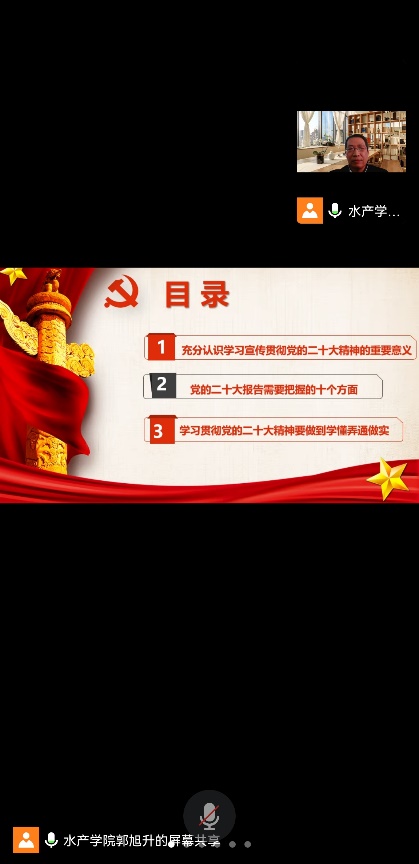 12月13日下午,水产学院党总支书记、院长郭旭升以《学习贯彻党的二十大精神,踔厉奋发,勇毅前行》为题,采用线上线下相结合的方式,为学院全体师生党员、部分入党积极分子讲了一堂精彩的党课。