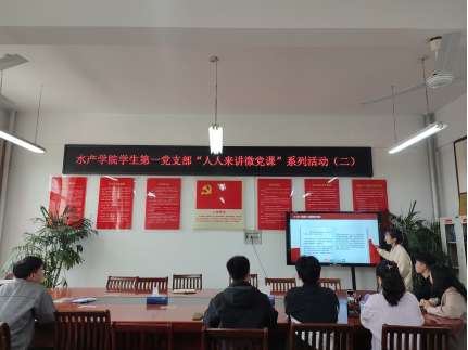 3月29日下午,水产学院学生第一党支部开展“人人来讲微党课”系列活动第二期。本期活动依然采用线上线下相结合的方式在2C330党员活动室和腾讯会议同步进行。活动由学生第一党支部书记晏方舟同志主持,支部全体党员参加。