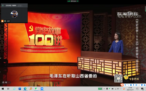 首先,冯德祥带领大家学习了学习强国《党史学习100讲》第53讲《艰苦奋斗 奋发图强》,节目讲述了大寨精神、红旗渠精神等奋斗精神。冯德祥告诉同学们历史是最好的教科书,大家要树立正确的党史观,并从学习、家庭、人生、行业、国家五个角度为学生阐述了在不同时期奋斗的意义和价值。
