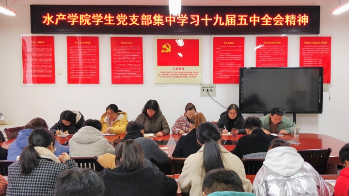 2020年11月25日,在2C330会议室,水产学院学生党支部集中学习第十九届五中全会精神。参会人员有水产学院黄光玲老师,晏方舟老师,李建玲老师,龚静老师,刘开放老师等,以及水产学院学生党员和预备党员,晏老师主持会议。