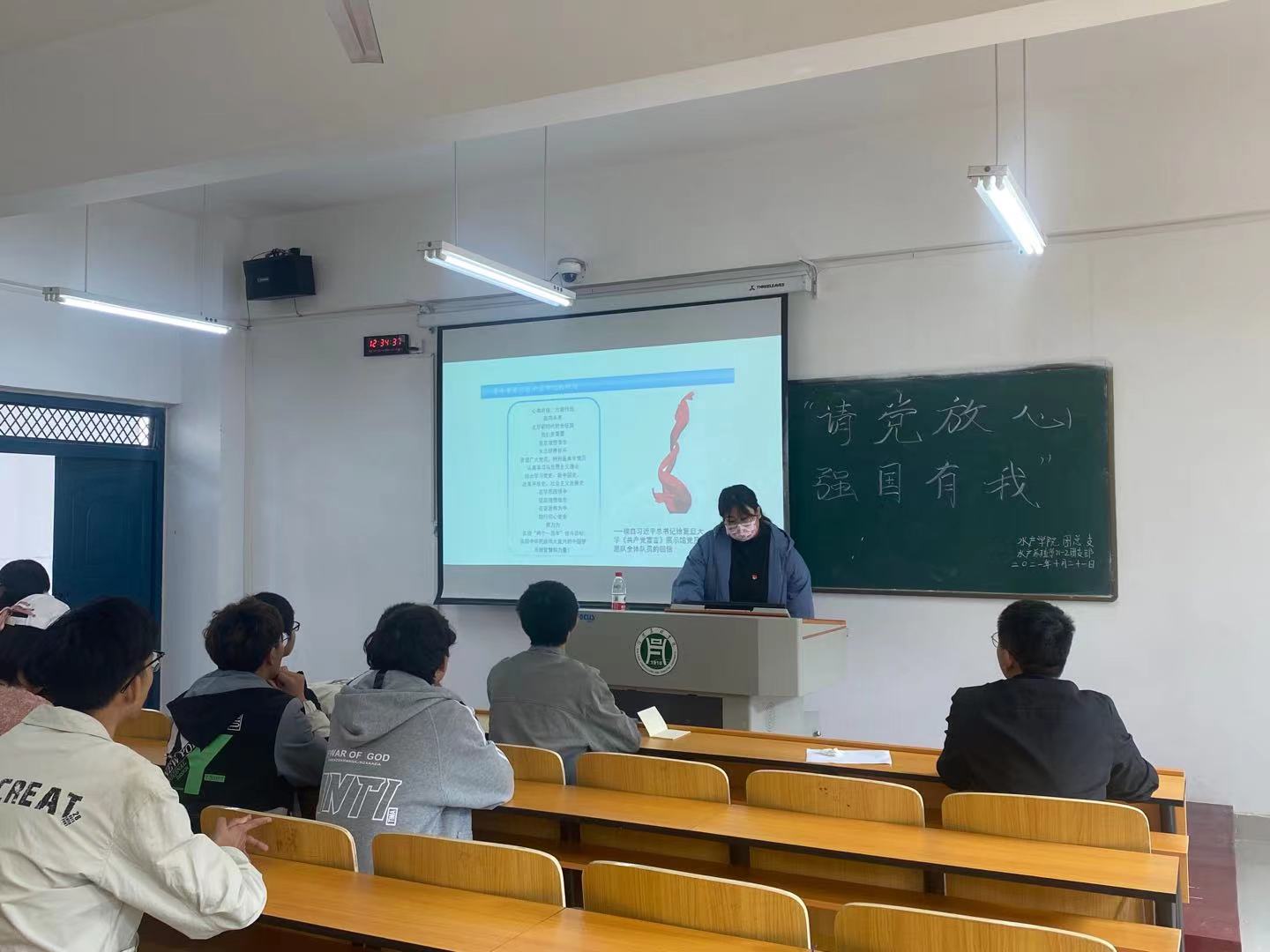 2021年10月21日中午,水产学院学生党支部开展主题党日活动,选派学生党员担任低年级班级政治辅导员,参与低年级班级团日活动。本次团日活动以“请党放心 强国有我”为主题,党支部选派学生党员张辉、王璐瑶、徐玉清、李谭栋、张利敏、孔双月等,分别在对应班级监督指导团日活动的开展。