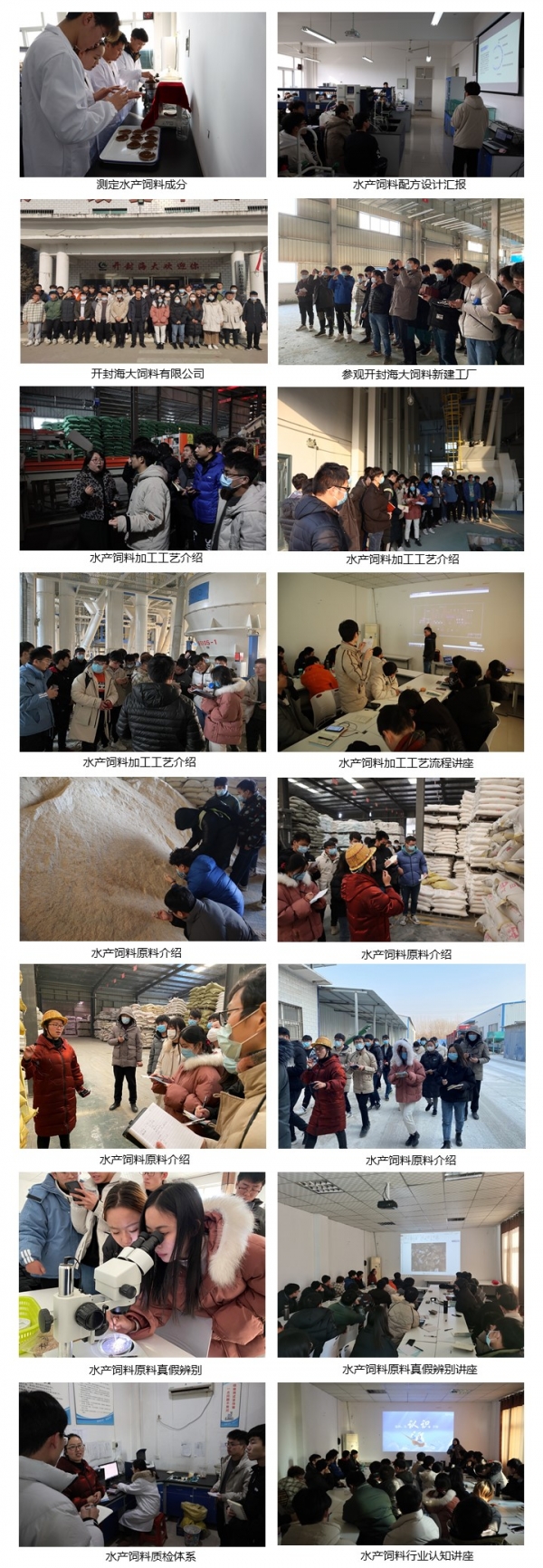 12月23日至25日,由冯德祥老师带领2018级水产养殖学(专业拓展)2018-1、2018-2班40名学生赴开封海大饲料有限公司进行了《水产动物营养与饲料学》校外实训环节。开封海大公司派出了包括人力资源经理、生产经理、技术服务经理、品控经理、一线骨干员工在内的导师组。