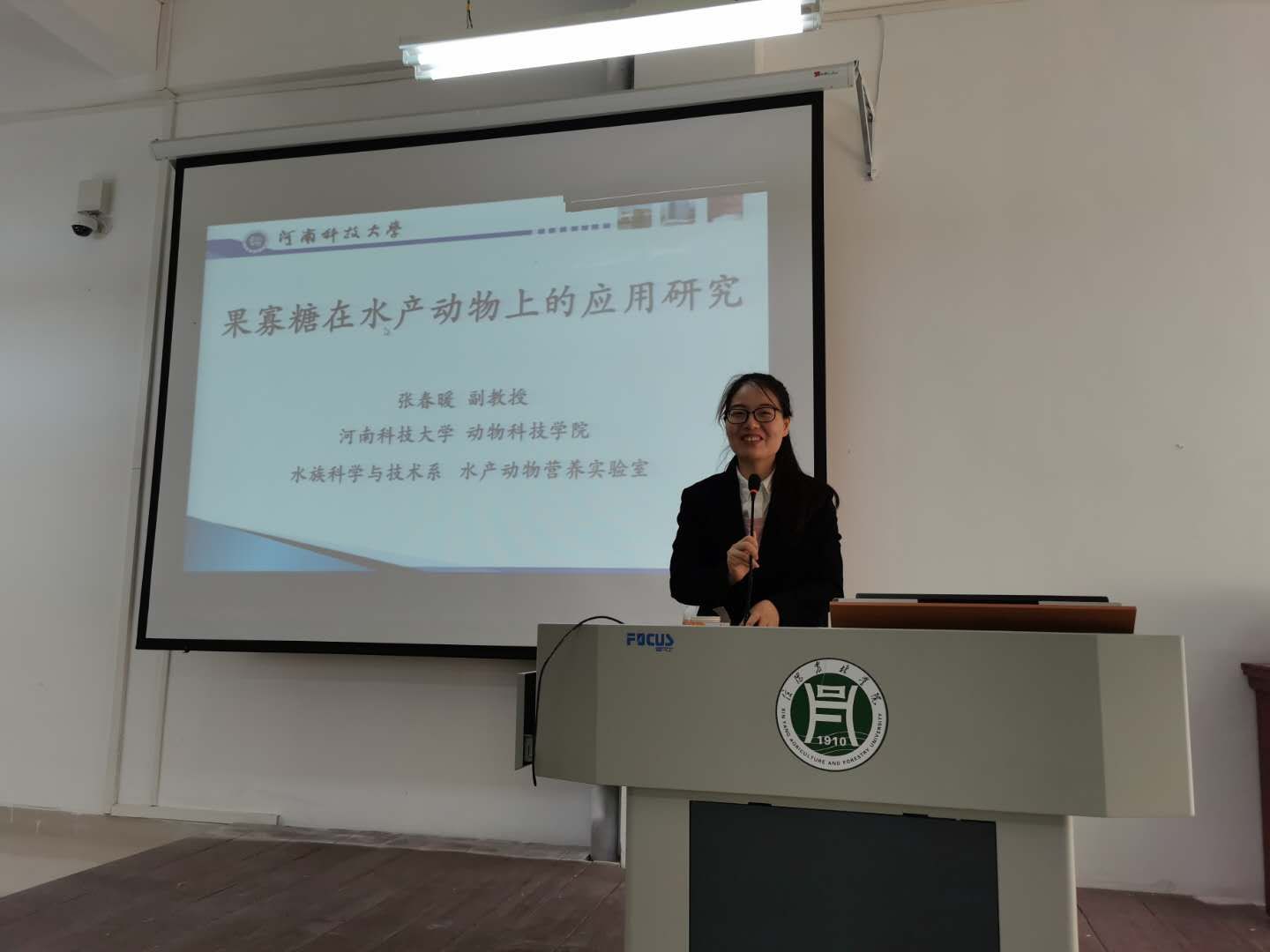 10月23日下午,河南科技大学张春暖副教授在二教604为水产学院师生作了一场《果寡糖在水产动物上的应用研究》的学术报告,会议由水产学院科研副院长吴坤杰主持。水产学院专业老师和部分学生参加了学术报告会。